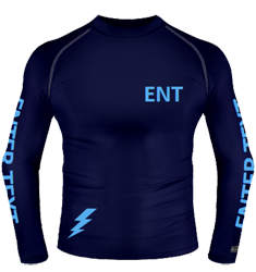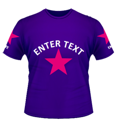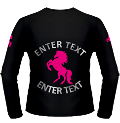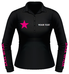 Black performance, large silver text, fuchsia pony design Bottle polo, gold glitter text Navy baselayer, sky arm text and spark hip design Black polo, fuchsia forearm text and chest designs Red polo, navy fleur-de-lis chest and arm designs Navy tee, curved athletic text and yellow star Purple tee, fuchsia stars, white chest and arm text